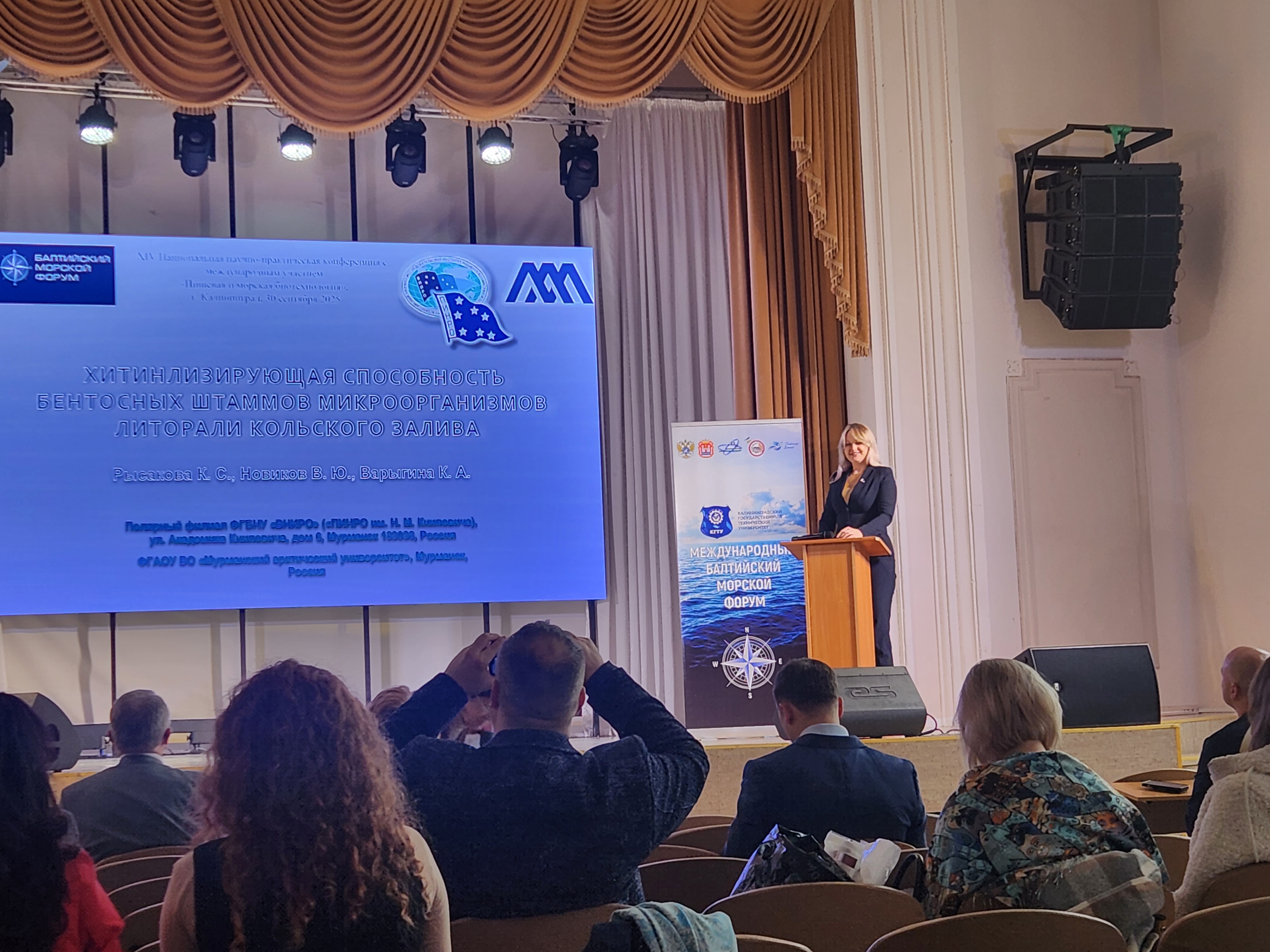 В конце сентября − начале октября на базе Калининградского государственного технического университета прошли XIII Международный Балтийский морской форум и XIV Национальная научно- практическая конференция с международным участием «Пищевая и морская биотехнология». Заведующая лабораторией химико-аналитических исследований Центра экологического мониторинга Кира Рысакова представила доклад на тему “Хитинлизирующая способность бентосных штаммов микроорганизмов литорали Кольского залива”.