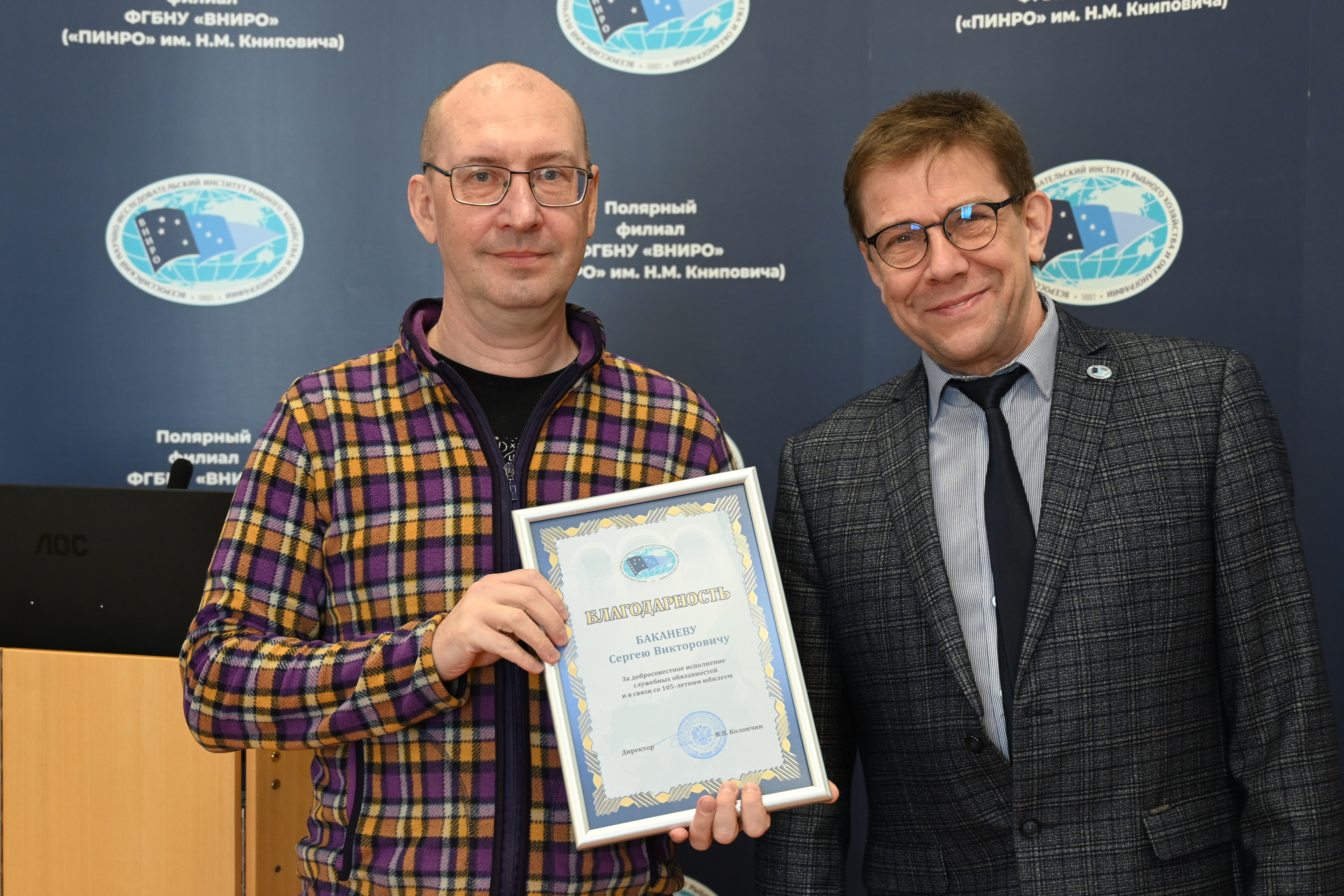 Также в торжественной обстановке Врио руководителя Полярного филиала ВНИРО Константин Соколов вручил подведомственные награды отличившимся сотрудникам.