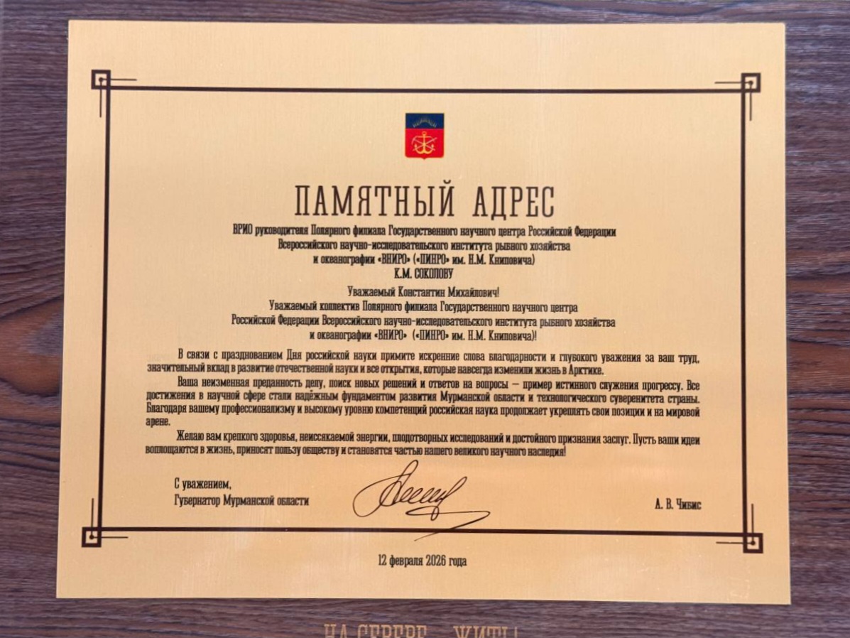Губернатор Мурманской области Андрей Чибис лично поздравил ученых с важным праздником, вручил памятные адреса, медали и наградами победителям различных конкурсов. Один из памятных адресов – Полярному филиалу.